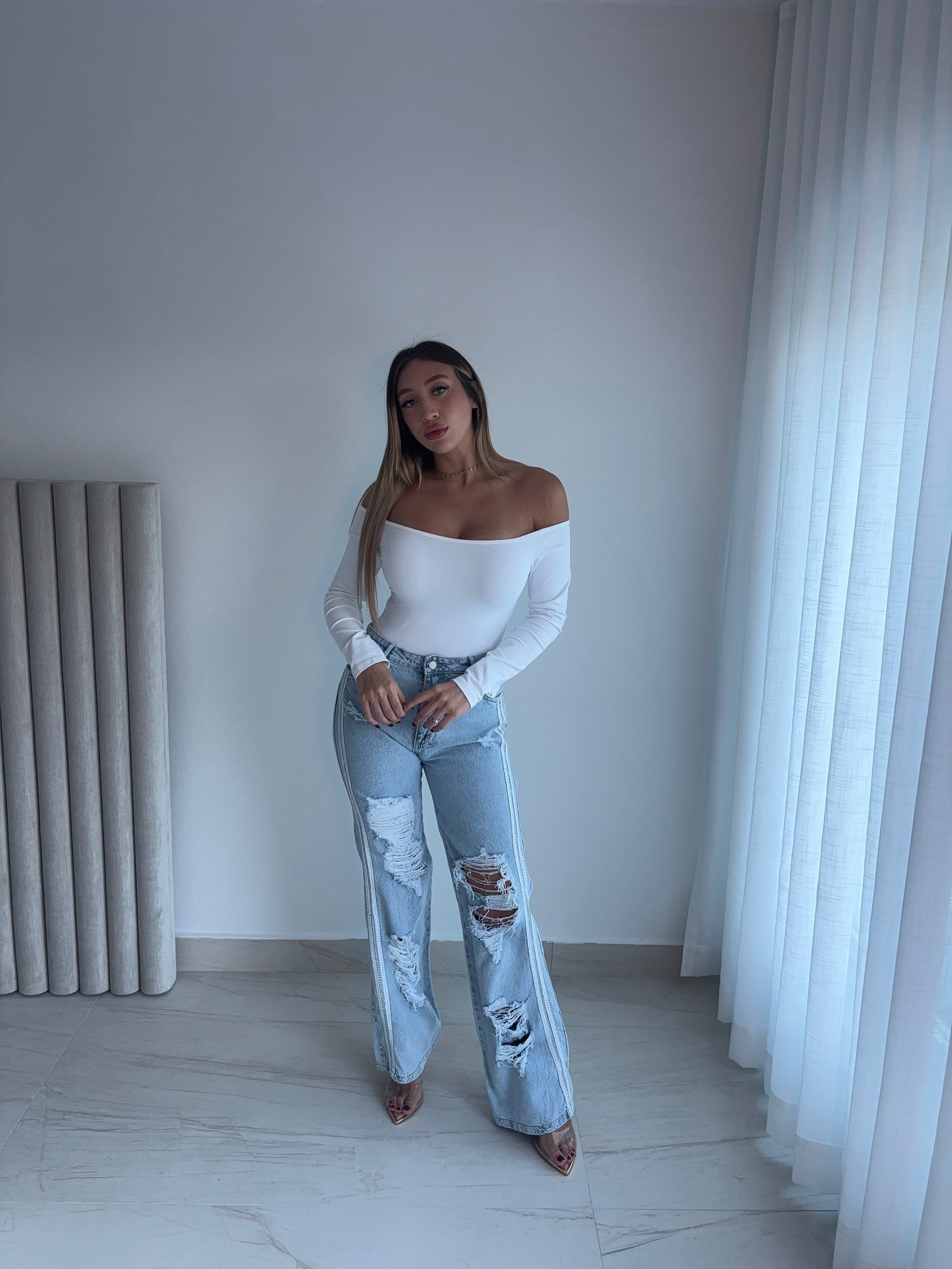 High-waisted denim pants featuring distressed details with ripped accents and subtle sparkle throughout. Designed with white stripe detailing along the sides for a sporty yet elevated look. Flattering straight-leg fit that runs true to size.